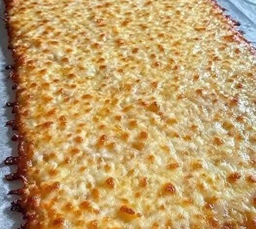 • Spread the cheese “dough” into a round crust shape on the parchment-lined tray (about ¼ inch thick).